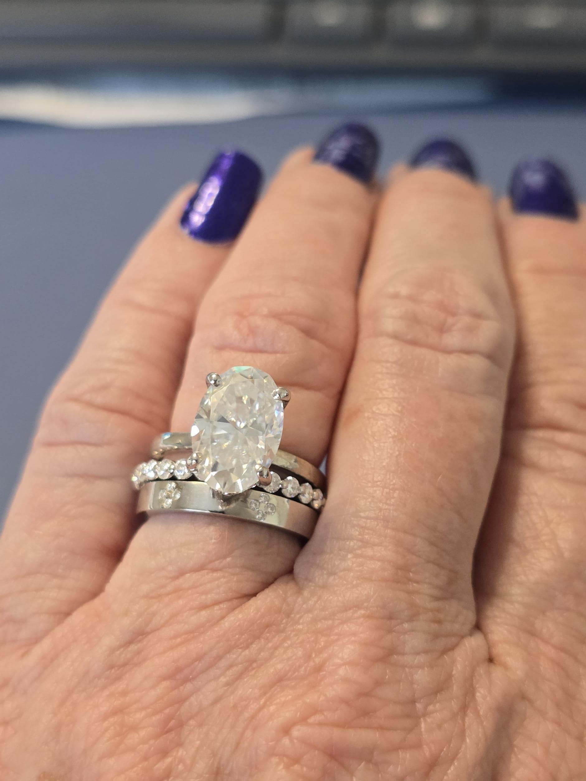 The ring is beautiful! I ordered it a little larger than I usually wear because of the 3 bands and it fits perfectly. Definitely sparkles and looks real! I wanted to see how a 4 CT would look on my hand...fantastic!